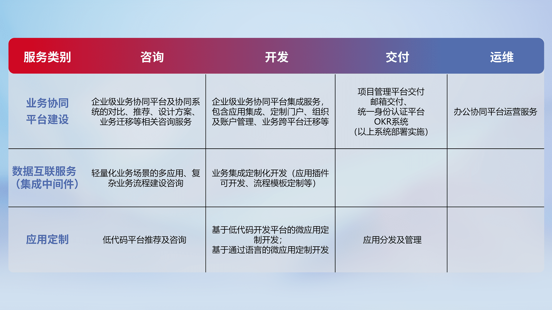 针对钉钉、、企微、、、、IDaas等平台级产品提供产品的规划、、、方案、、、交付、、、定制化开发等服务,,实现如统一协同办公、、智能客户服务、、混合会议管理、、智能数据查询、、、、等业务场景,,,,实现数字化转型。。。。