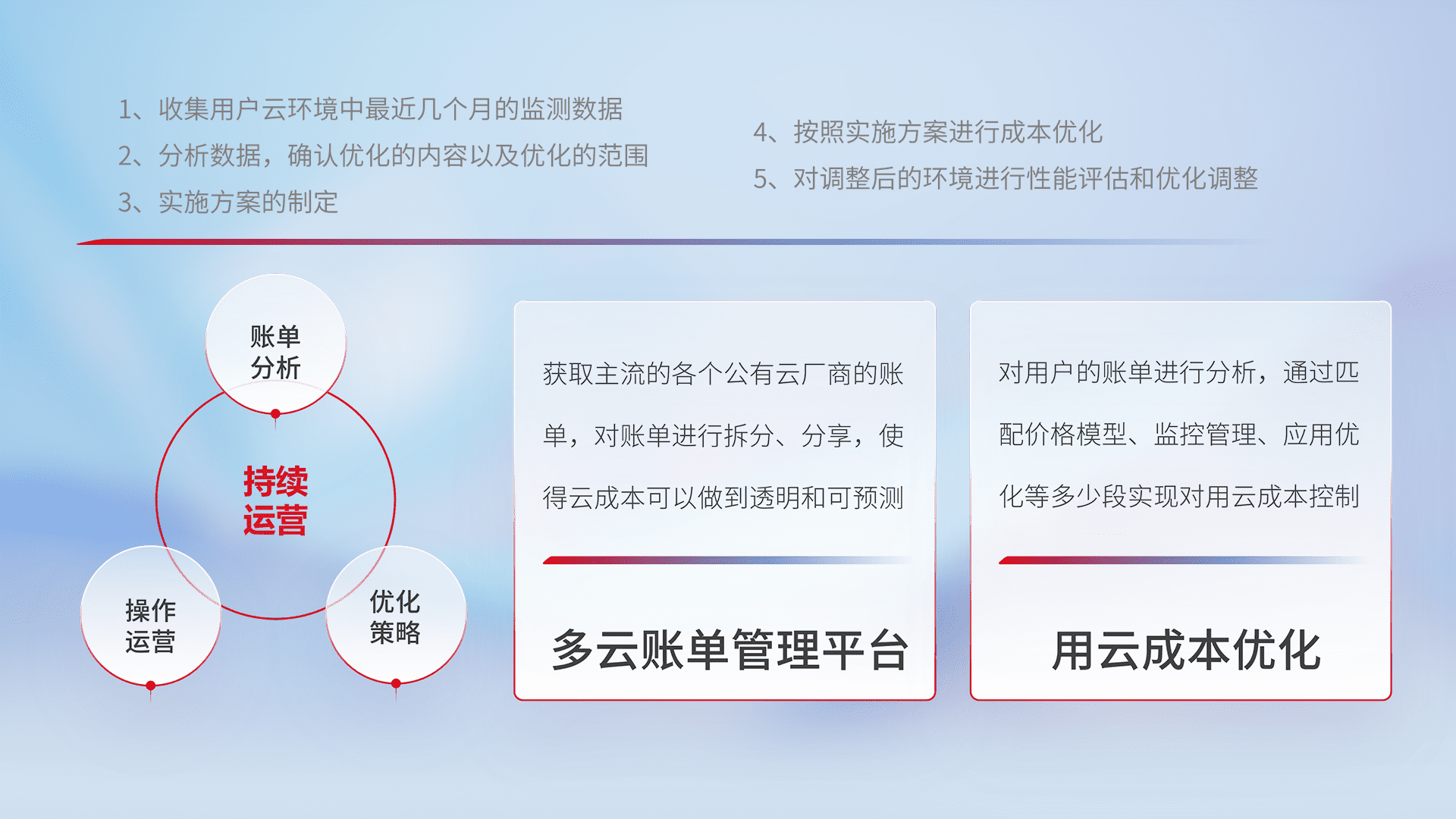 通过多云纳管,,,,以统一的资源数据模型把客户的云资源进行抽象和封装,,,进而实现对多云资源的统一操作,,,保障云资源管理的可靠性、、、稳定性与可用性。。量身定制化运维内容,,配置、、、、开发运维、、补丁管理、、、、备份、、、监控、、、认证和访问管理、、、、审计和日常巡检等,,保障在用云过程中的可靠度,,,稳定度以及高可用率。。。