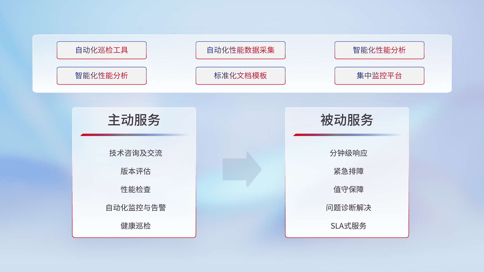 智能化工具和标准化文档,,保障服务质量,,,提供主动服务(包含技术咨询、、、版本评估、、性能检查、、、自动化监控与告警、、健康巡检)和被动服务包含(分钟级响应、、、、紧急排障、、值守保障、、、、问题诊断解决、、、SLA服务)。。
