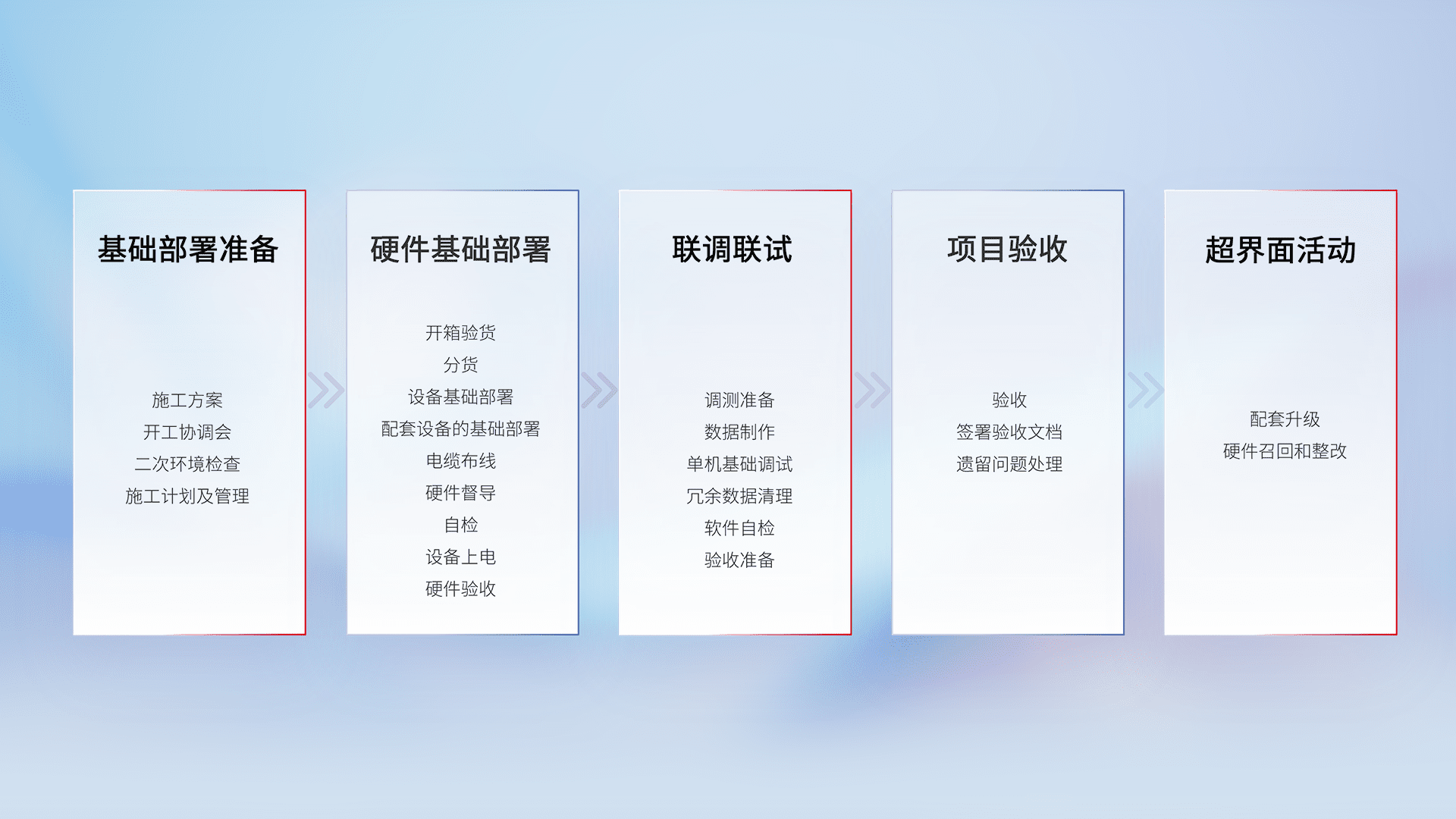 从基础部署准备、、硬件基础部署、、、联调联试、、、项目验收、、越界面活动的全过程可追溯,,保证施工质量和进度。。。